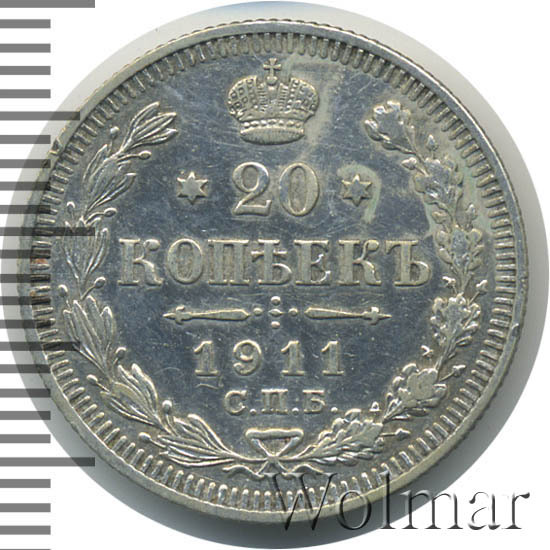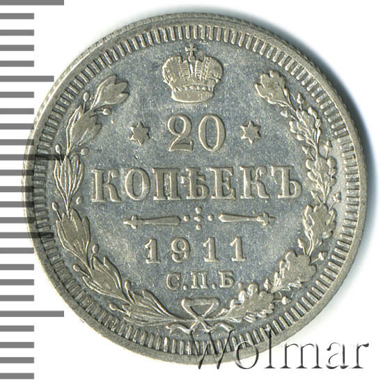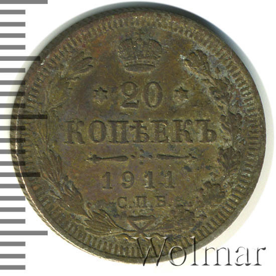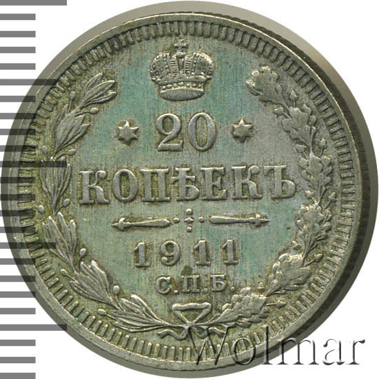 В центре указан номинал - цифра «20», ограниченная с обеих сторон звездочками. Над цифрой – Корона Российской империи. Под цифрой номинала — слово "КОПЕЕК". Ниже, расположен декоративный разделитель в виде двух разнонаправленных фигурных линий и стилизованным из точек крестом между ними. Под разделителем — дата выпуска монеты «1911». Под цифрой даты — обозначение монетного двора «С.П.Б.». Вдоль канта, не доходя до короны, изображен венок из лавровой и дубовой ветвей, которые, в нижней части, перевязаны лентой на узел бантом. По окружности канта имеются рельефные элементы, выполненные в виде зубцов.