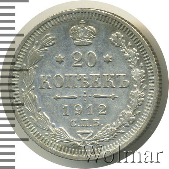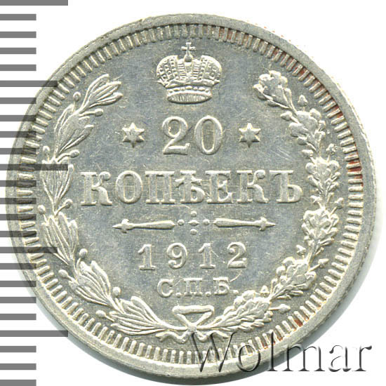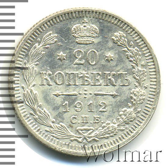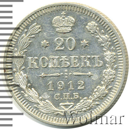 В центре указан номинал - цифра «20», ограниченная с обеих сторон звездочками. Над цифрой – Корона Российской империи. Под цифрой номинала — слово "КОПЕЕК". Ниже, расположен декоративный разделитель в виде двух разнонаправленных фигурных линий и стилизованным из точек крестом между ними. Под разделителем — дата выпуска монеты «1912». Под цифрой даты — обозначение монетного двора «С.П.Б.». Вдоль канта, не доходя до короны, изображен венок из лавровой и дубовой ветвей, которые, в нижней части, перевязаны лентой на узел бантом. По окружности канта имеются рельефные элементы, выполненные в виде зубцов.
