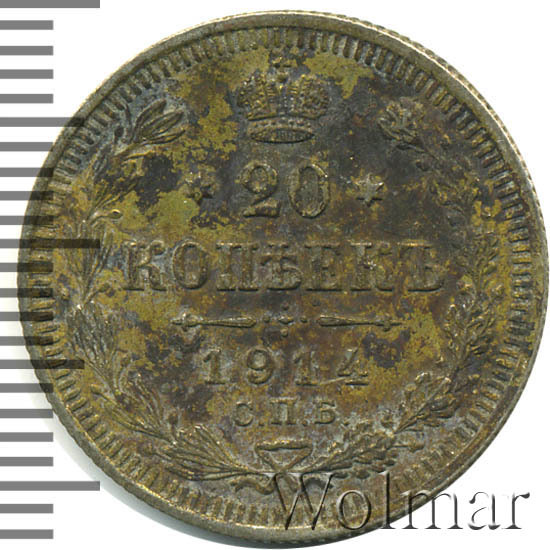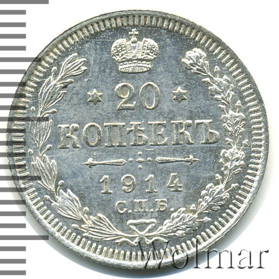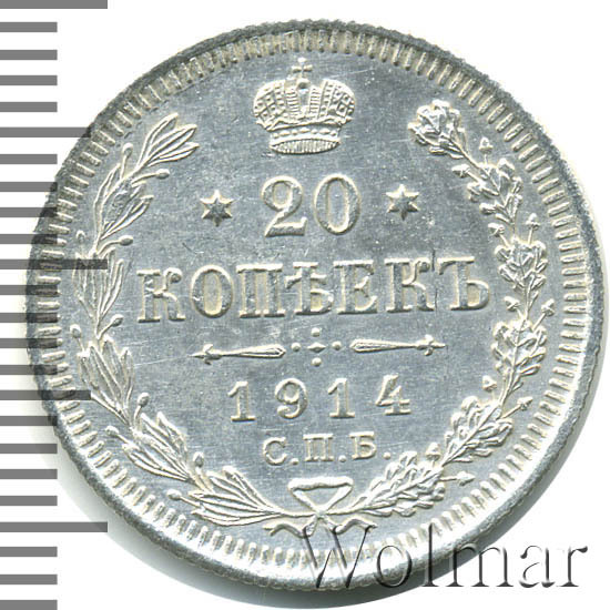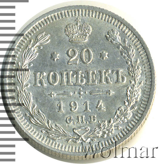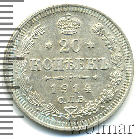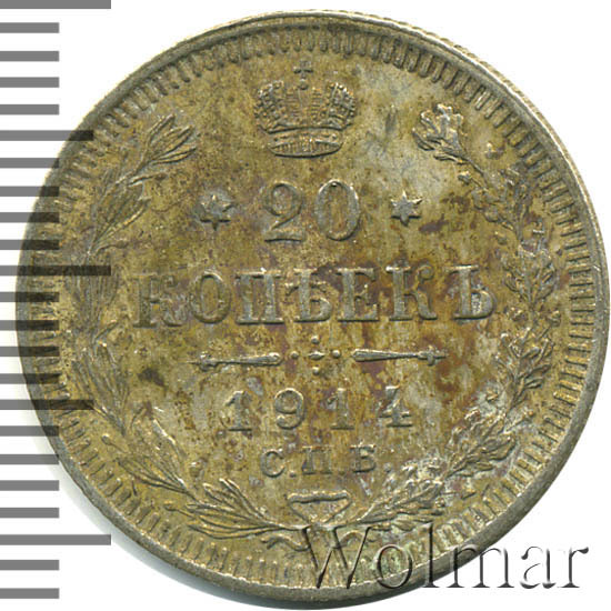 В центре указан номинал - цифра «20», ограниченная с обеих сторон звездочками. Над цифрой – Корона Российской империи. Под цифрой номинала — слово "КОПЕЕК". Ниже, расположен декоративный разделитель в виде двух разнонаправленных фигурных линий и стилизованным из точек крестом между ними. Под разделителем — дата выпуска монеты «1914». Под цифрой даты — обозначение монетного двора «С.П.Б.». Вдоль канта, не доходя до короны, изображен венок из лавровой и дубовой ветвей, которые, в нижней части, перевязаны лентой на узел бантом. По окружности канта имеются рельефные элементы, выполненные в виде зубцов.