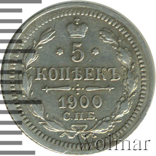 В центре указан номинал «5», ограниченный с обеих сторон звездочками. Над цифрой – Корона Российской империи. Под цифрой номинала — слово "КОПЕЕК". Ниже, расположен декоративный разделитель в виде двух разнонаправленных фигурных линий и стилизованным из точек крестом между ними. Под разделителем — дата выпуска монеты «1900». Под цифрой даты — обозначение монетного двора «С.П.Б.». Вдоль канта, не доходя до короны, изображен венок из лавровой и дубовой ветви, которые в нижней части перевязаны лентой на узел бантом. По окружности канта имеются рельефные элементы, выполненные в виде зубцов.