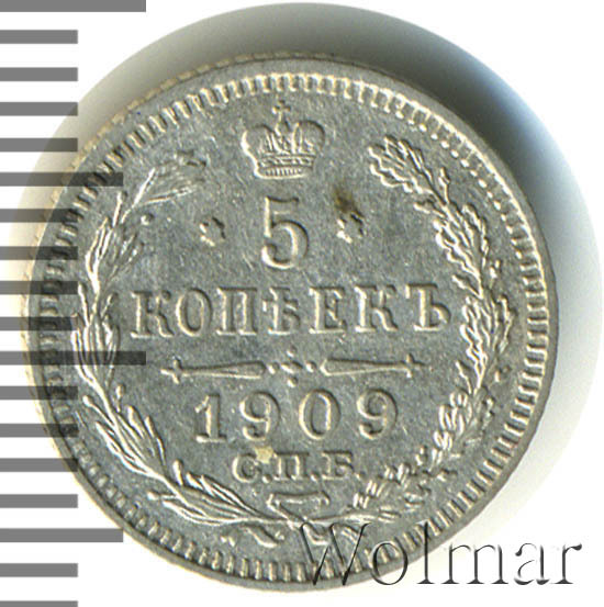 В центре указан номинал «5», ограниченный с обеих сторон звездочками. Над цифрой – Корона Российской империи. Под цифрой номинала — слово "КОПЕЕК". Ниже, расположен декоративный разделитель в виде двух разнонаправленных фигурных линий и стилизованным из точек крестом между ними. Под разделителем — дата выпуска монеты «1909». Под цифрой даты — обозначение монетного двора «С.П.Б.». Вдоль канта, не доходя до короны, изображен венок из лавровой и дубовой ветви, которые в нижней части перевязаны лентой на узел бантом. По окружности канта имеются рельефные элементы, выполненные в виде зубцов.