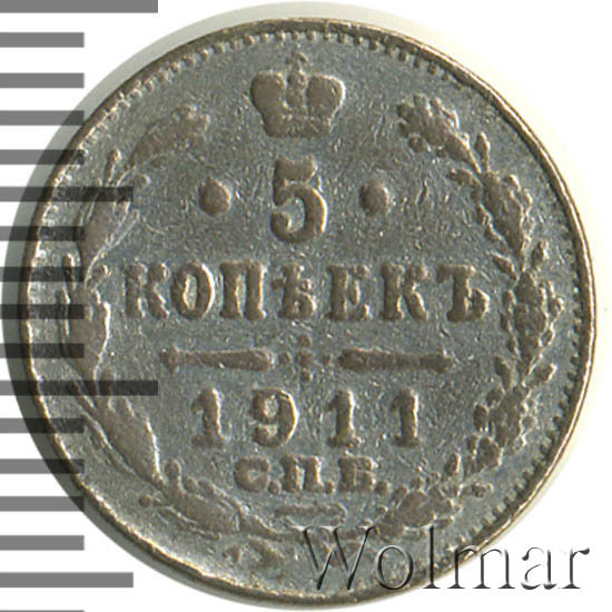 В центре указан номинал «5», ограниченный с обеих сторон звездочками. Над цифрой – Корона Российской империи. Под цифрой номинала — слово "КОПЕЕК". Ниже, расположен декоративный разделитель в виде двух разнонаправленных фигурных линий и стилизованным из точек крестом между ними. Под разделителем — дата выпуска монеты «1911». Под цифрой даты — обозначение монетного двора «С.П.Б.». Вдоль канта, не доходя до короны, изображен венок из лавровой и дубовой ветви, которые в нижней части перевязаны лентой на узел бантом. По окружности канта имеются рельефные элементы, выполненные в виде зубцов.