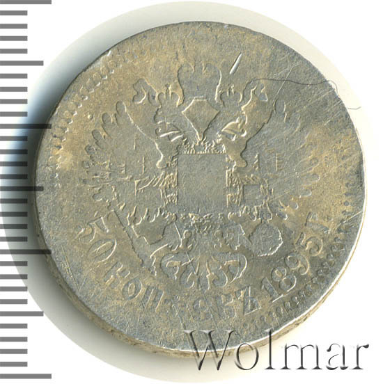 В центре изображен Малый Государственный Герб Российской империи - двуглавый орёл, головы которого увенчаны двумя коронами, третья, большая корона над ними. Все они соединены орденской лентой ордена Св. Апостола Андрея Первозванного. На груди орла расположен Московский герб, в щите изображен Георгий Победоносец с копьем поражающий дракона. Вокруг щита цепь ордена Св. Апостола Андрея Первозванного. На крыльях изображены гербы: Царства Казанского, Польского, Херсонеса Таврического, Астраханского, Сибирского, Грузинского и герб соединенных княжеств Киевского, Новгородского и Владимирского — по 4 на каждое крыло. В правой лапе орла – скипетр, в левой – держава. Под ним слева направо изображены: номинал - надпись «50 копеек» и дата выпуска «1895 Г.». По окружности канта имеются рельефные элементы, выполненные в виде зубцов.