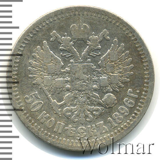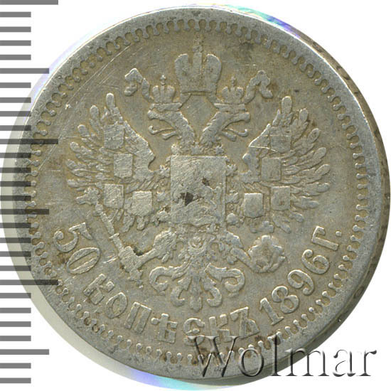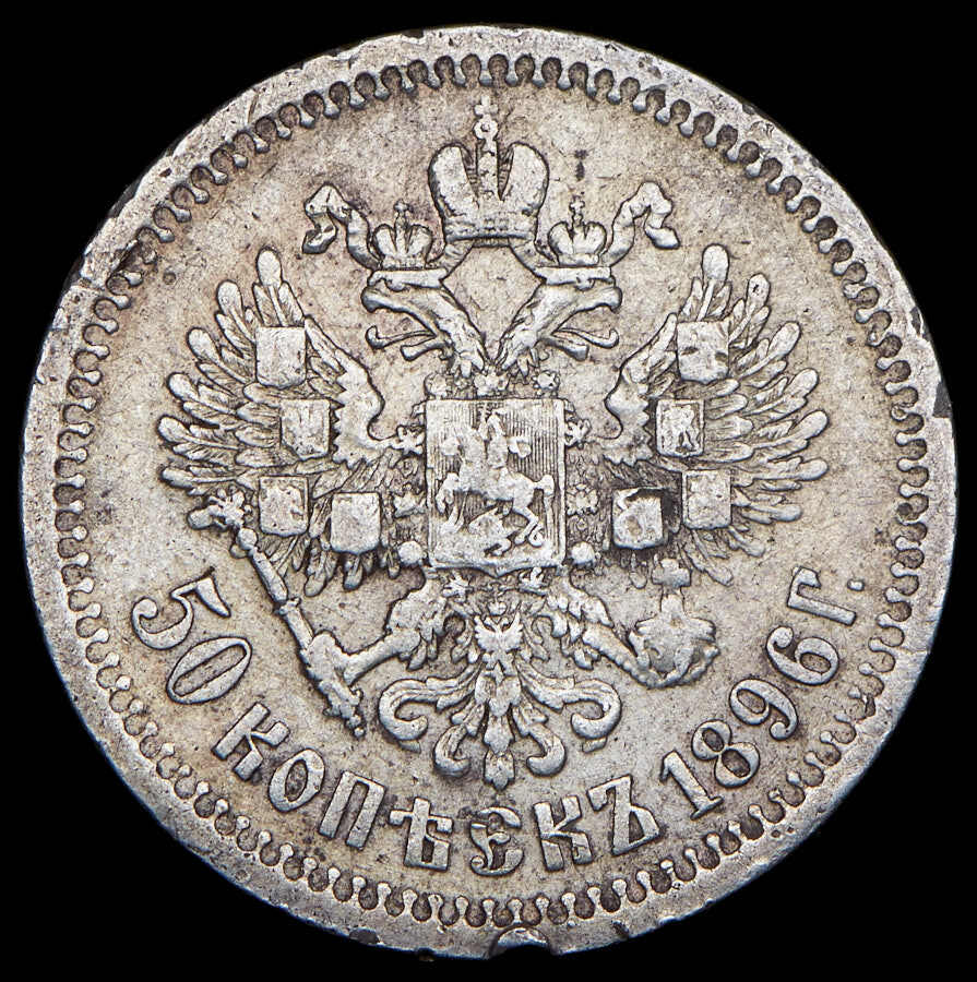 В центре изображен Малый Государственный Герб Российской империи - двуглавый орёл, головы которого увенчаны двумя коронами, третья, большая корона над ними. Все они соединены орденской лентой ордена Св. Апостола Андрея Первозванного. На груди орла расположен Московский герб, в щите изображен Георгий Победоносец с копьем поражающий дракона. Вокруг щита цепь ордена Св. Апостола Андрея Первозванного. На крыльях изображены гербы: Царства Казанского, Польского, Херсонеса Таврического, Астраханского, Сибирского, Грузинского и герб соединенных княжеств Киевского, Новгородского и Владимирского — по 4 на каждое крыло. В правой лапе орла – скипетр, в левой – держава. Под ним слева направо изображены: номинал - надпись «50 копеек» и дата выпуска «1896 Г.». По окружности канта имеются рельефные элементы, выполненные в виде зубцов.