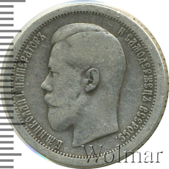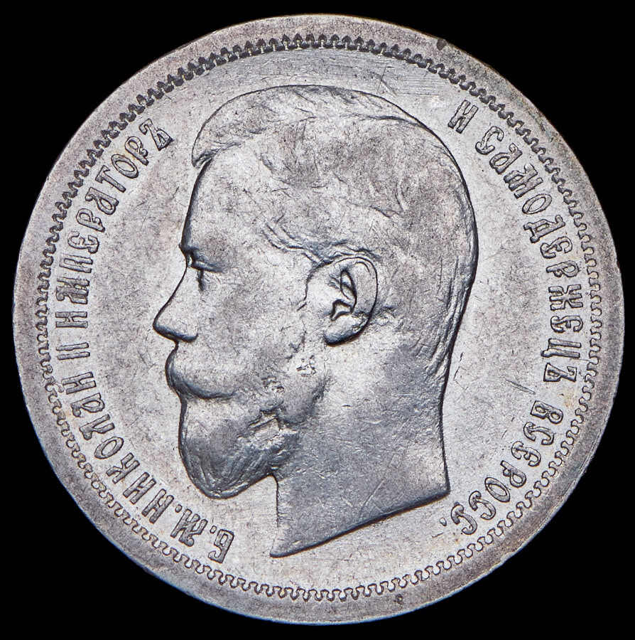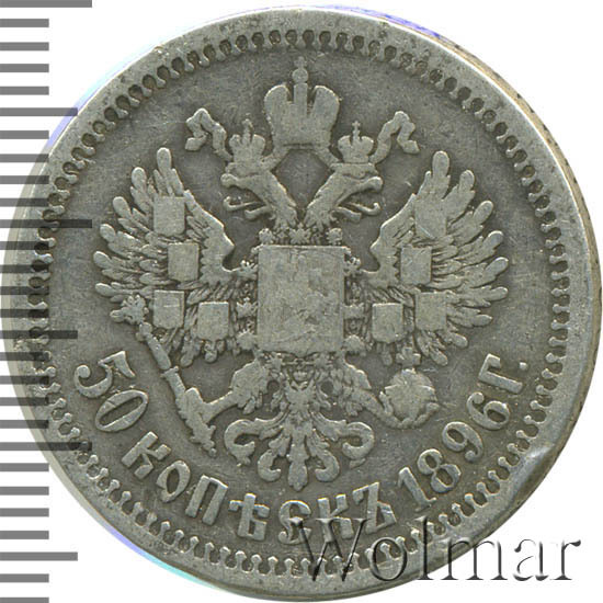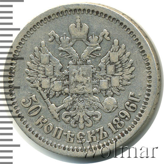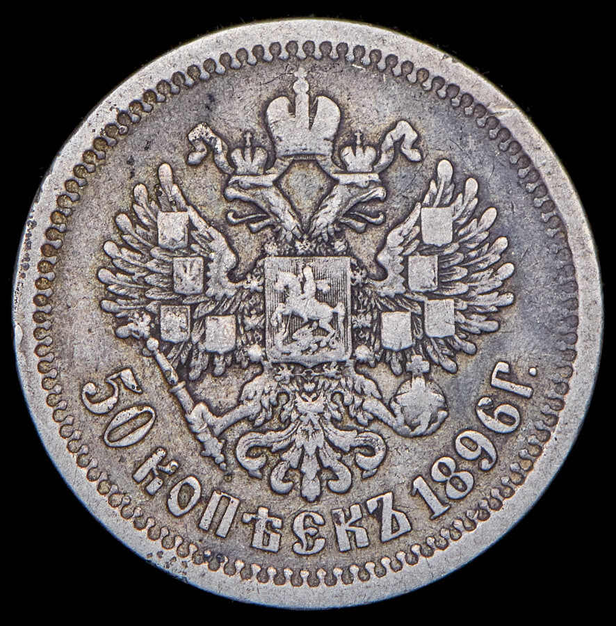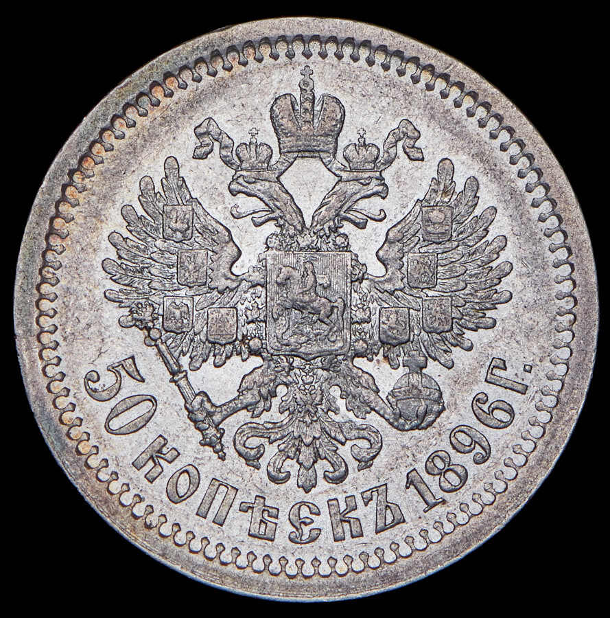 Данный тип пятидесяти копеечных монет чеканился в неизменном виде 1895 по 1914 гг. Изображение аверса: в центре, профильный портрет Николая II. По окружности надпись: «Б.М.Николай II Императоръ (слева) и Самодержецъ Всеросс.» (справа). Реверс: Малый Государственный Герб Российской Империи, образца 1883 года. Под орлом надпись: «50 копеек 1896 г.». По краю монеты (на обеих сторонах) – узорчатый кант.Буквы АГ на гурте - инициалы минцмейстера Петербургского монетного двора Аполлона Грасгофа, который занимал эту должность с 1883 по 1899 год.