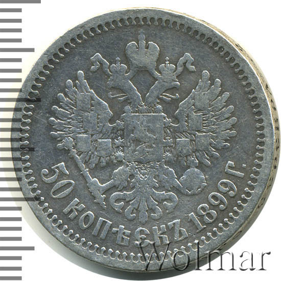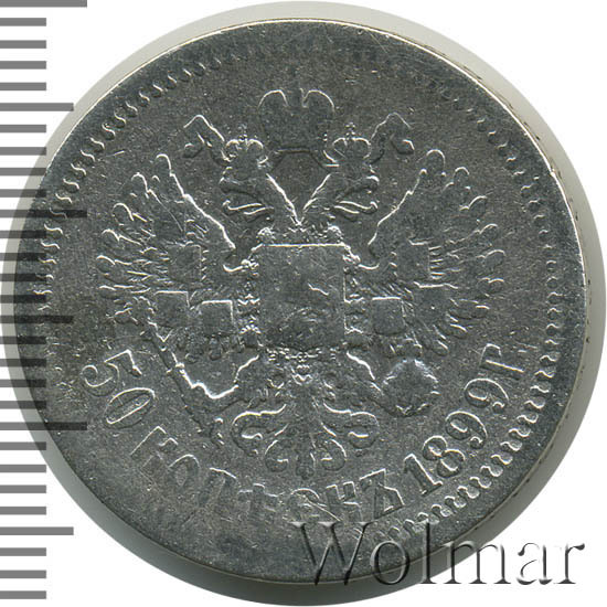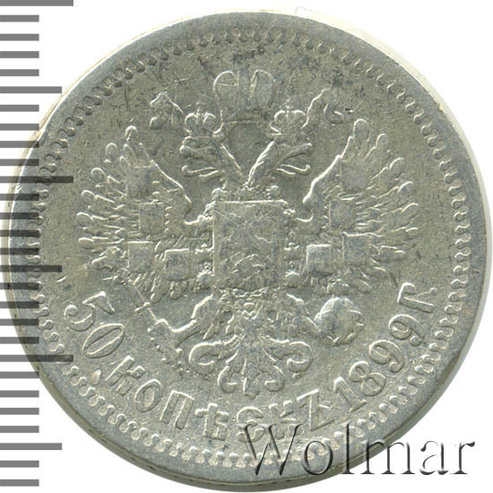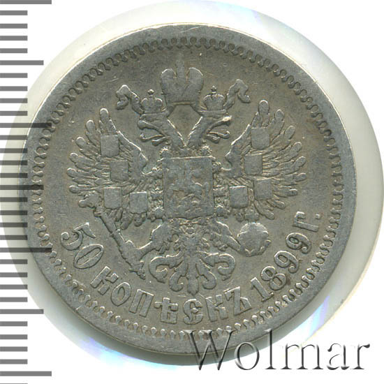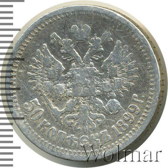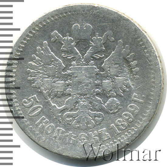 В центре изображен Малый Государственный Герб Российской империи - двуглавый орёл, головы которого увенчаны двумя коронами, третья, большая корона над ними. Все они соединены орденской лентой ордена Св. Апостола Андрея Первозванного. На груди орла расположен Московский герб, в щите изображен Георгий Победоносец с копьем поражающий дракона. Вокруг щита цепь ордена Св. Апостола Андрея Первозванного. На крыльях изображены гербы: Царства Казанского, Польского, Херсонеса Таврического, Астраханского, Сибирского, Грузинского и герб соединенных княжеств Киевского, Новгородского и Владимирского — по 4 на каждое крыло. В правой лапе орла – скипетр, в левой – держава. Под ним слева направо изображены: номинал - надпись «50 копеек» и дата выпуска «1899 Г.». По окружности канта имеются рельефные элементы, выполненные в виде зубцов.