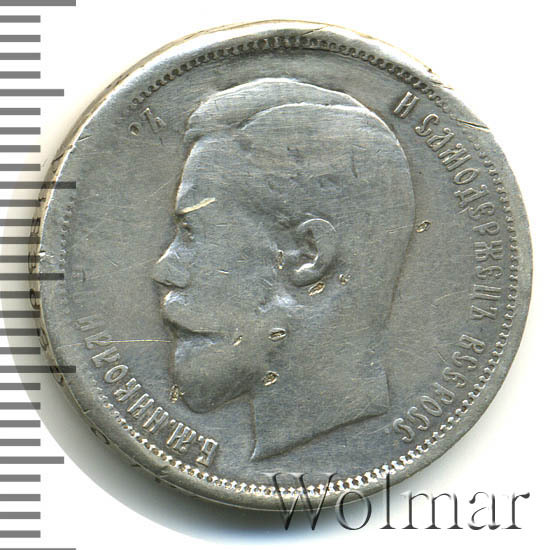 В центре профильный портрет влево императора Николая II. Слева надпись «Б.М. НИКОЛАЙ II ИМПЕРАТОР», справа - «И САМОДЕРЖЕЦ ВСЕРОСС.». По окружности канта имеются рельефные элементы, выполненные в виде зубцов.