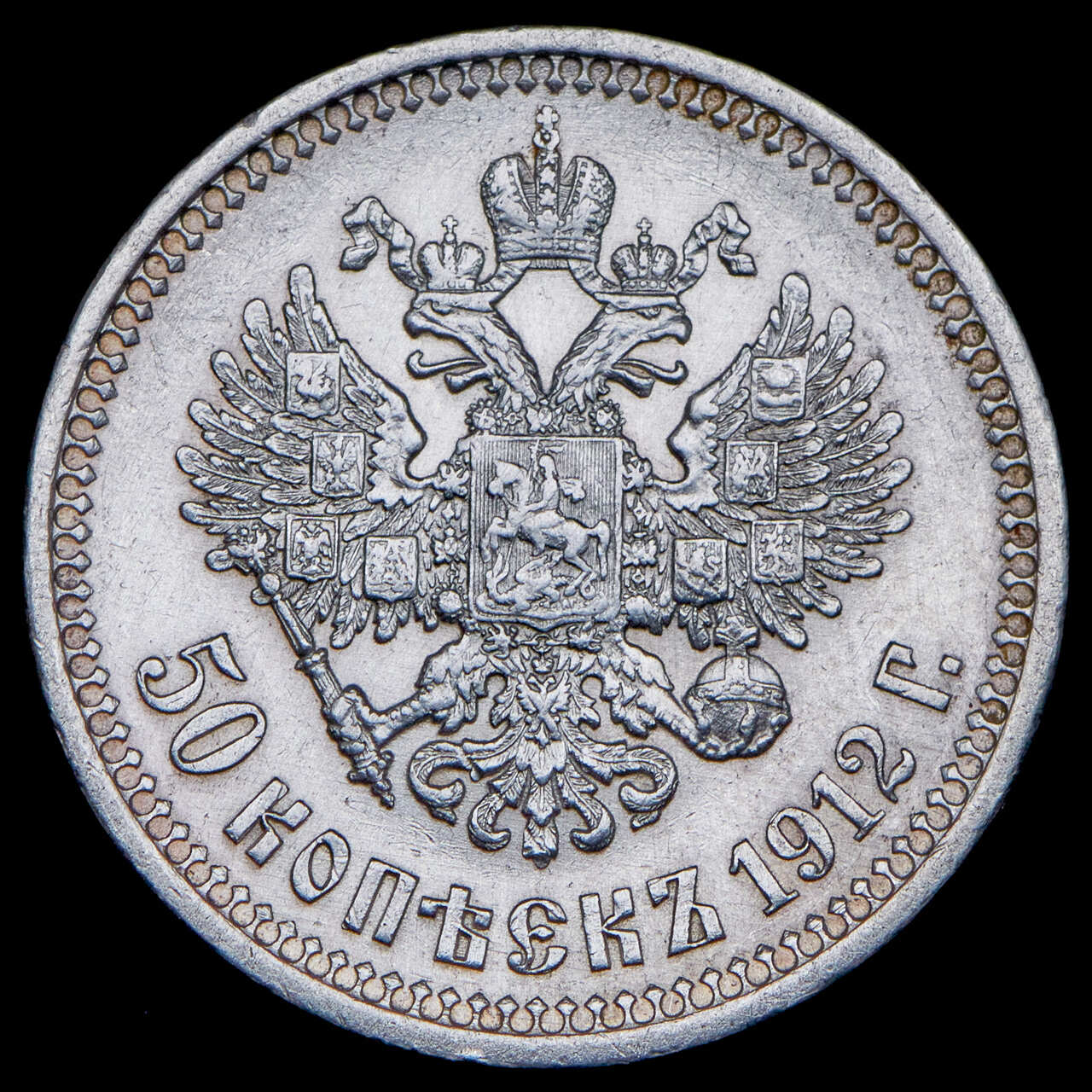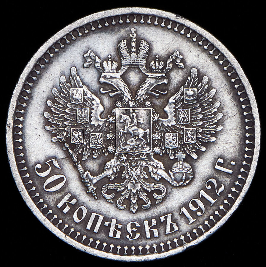 В центре изображен Малый Государственный Герб Российской империи - двуглавый орёл, головы которого увенчаны двумя коронами, третья, большая корона над ними. Все они соединены орденской лентой ордена Св. Апостола Андрея Первозванного. На груди орла расположен Московский герб, в щите изображен Георгий Победоносец с копьем поражающий дракона. Вокруг щита цепь ордена Св. Апостола Андрея Первозванного. На крыльях изображены гербы: Царства Казанского, Польского, Херсонеса Таврического, Астраханского, Сибирского, Грузинского и герб соединенных княжеств Киевского, Новгородского и Владимирского — по 4 на каждое крыло. В правой лапе орла – скипетр, в левой – держава. Под ним слева направо изображены: номинал - надпись «50 копеек» и дата выпуска «1912 Г.». По окружности канта имеются рельефные элементы, выполненные в виде зубцов.