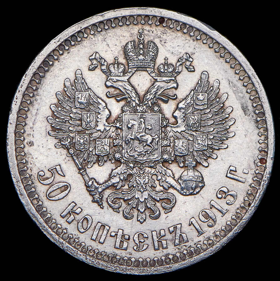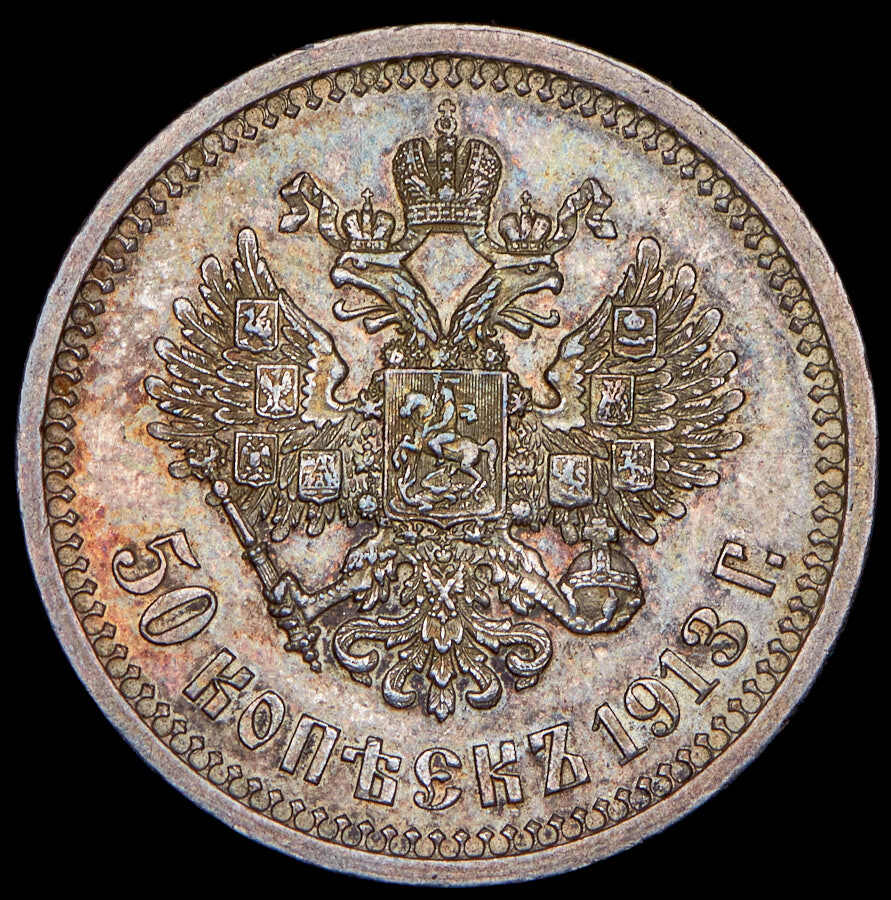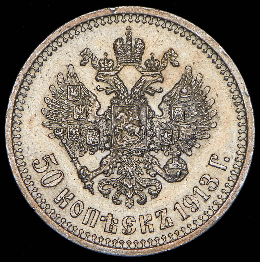 В центре изображен Малый Государственный Герб Российской империи - двуглавый орёл, головы которого увенчаны двумя коронами, третья, большая корона над ними. Все они соединены орденской лентой ордена Св. Апостола Андрея Первозванного. На груди орла расположен Московский герб, в щите изображен Георгий Победоносец с копьем поражающий дракона. Вокруг щита цепь ордена Св. Апостола Андрея Первозванного. На крыльях изображены гербы: Царства Казанского, Польского, Херсонеса Таврического, Астраханского, Сибирского, Грузинского и герб соединенных княжеств Киевского, Новгородского и Владимирского — по 4 на каждое крыло. В правой лапе орла – скипетр, в левой – держава. Под ним слева направо изображены: номинал - надпись «50 копеек» и дата выпуска «1913 Г.». По окружности канта имеются рельефные элементы, выполненные в виде зубцов.