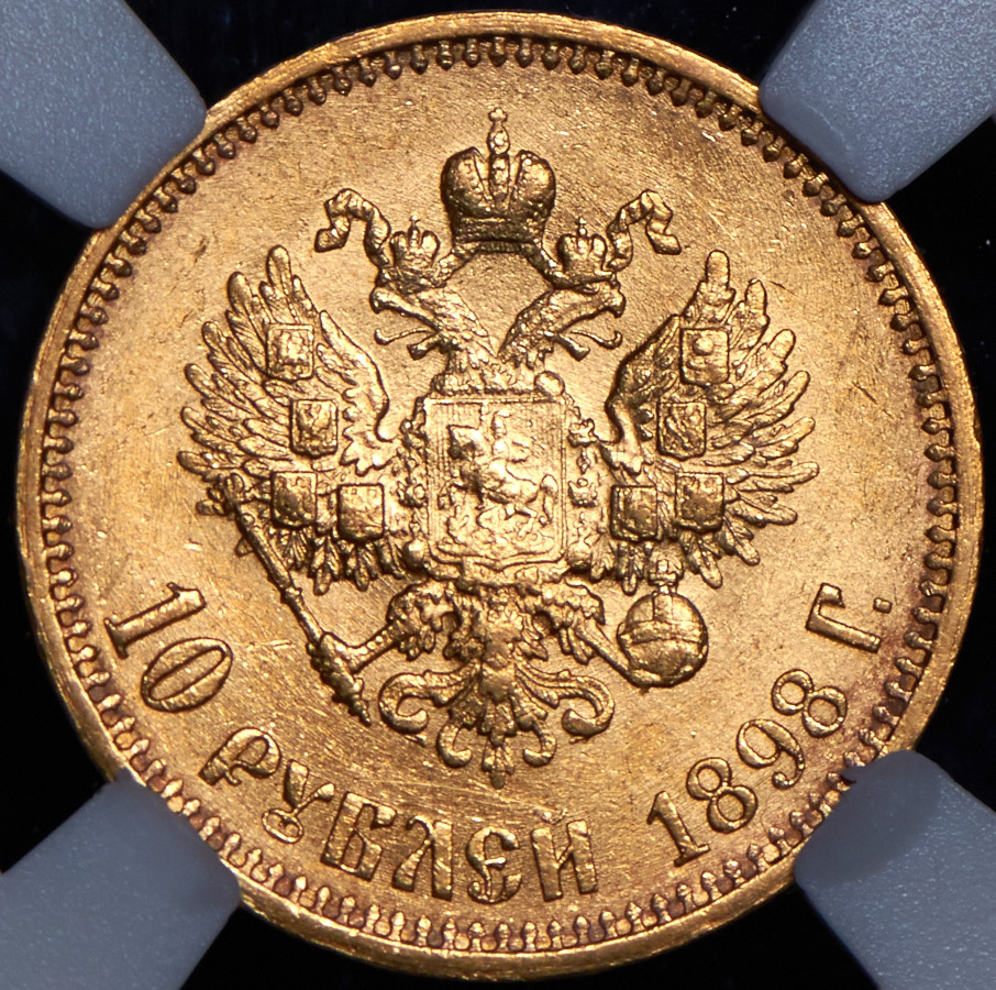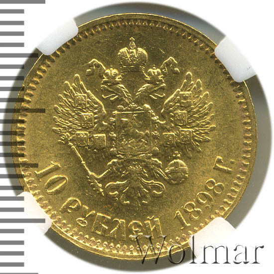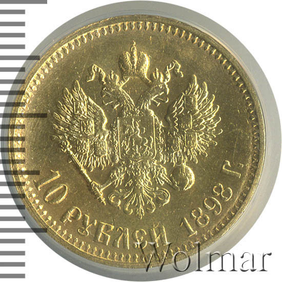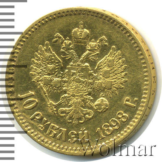 В центре изображен Малый Государственный Герб Российской империи - двуглавый орёл, головы которого увенчаны двумя коронами, третья, большая корона над ними. Все они соединены орденской лентой ордена Св. Апостола Андрея Первозванного. На груди орла расположен Московский герб, в щите изображен Георгий Победоносец с копьем поражающий дракона. Вокруг щита цепь ордена Св. Апостола Андрея Первозванного. На крыльях изображены гербы: Царства Казанского, Польского, Херсонеса Таврического, Астраханского, Сибирского, Грузинского, герб соединенных княжеств Киевского, Новгородского и Владимирского и герб Великого Княжества Финляндского — по 4 на каждое крыло. В правой лапе орла – скипетр, в левой – держава. Под ним слева направо изображены: номинал - надпись «10 РУБЛЕЙ» и дата выпуска «1898 Г.». По окружности канта имеются рельефные элементы, выполненные в виде зубцов.