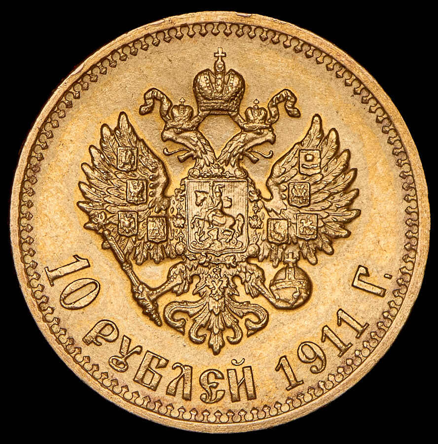 В центре изображен Малый Государственный Герб Российской империи - двуглавый орёл, головы которого увенчаны двумя коронами, третья, большая корона над ними. Все они соединены орденской лентой ордена Св. апостола Андрея Первозванного. На груди орла расположен Московский герб - щит с изображением Георгия Победоносца с копьём поражающего дракона. Вокруг щита цепь ордена Св. апостола Андрея Первозванного. На крыльях изображены гербы: Царства Казанского, Польского, Херсонеса Таврического, Астраханского, Сибирского, Грузинского и герб соединенных княжеств Киевского, Новгородского и Владимирского — по 4 на каждое крыло. В правой лапе орла – скипетр, в левой – держава. Под ним слева направо изображены: номинал - надпись «10 РУБЛЕЙ» и дата выпуска «1911 Г.». По окружности канта имеются рельефные элементы, выполненные в виде зубцов.