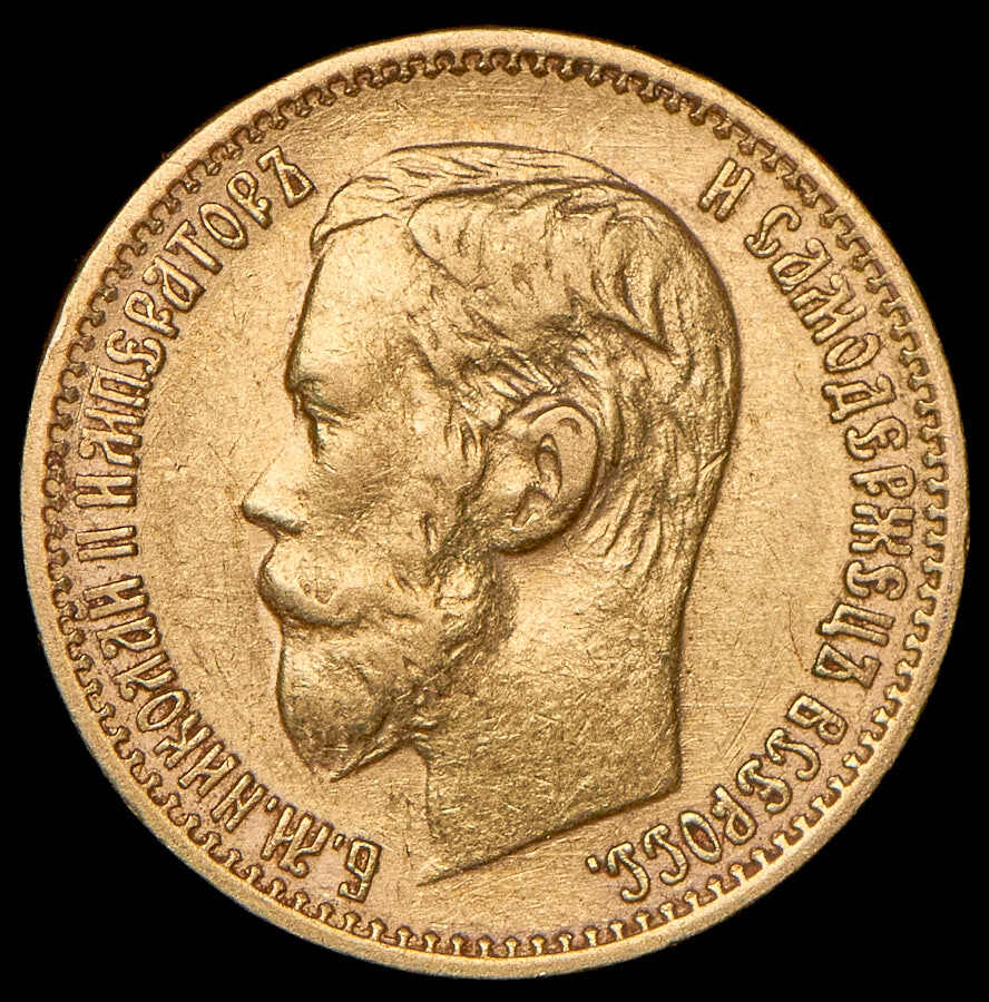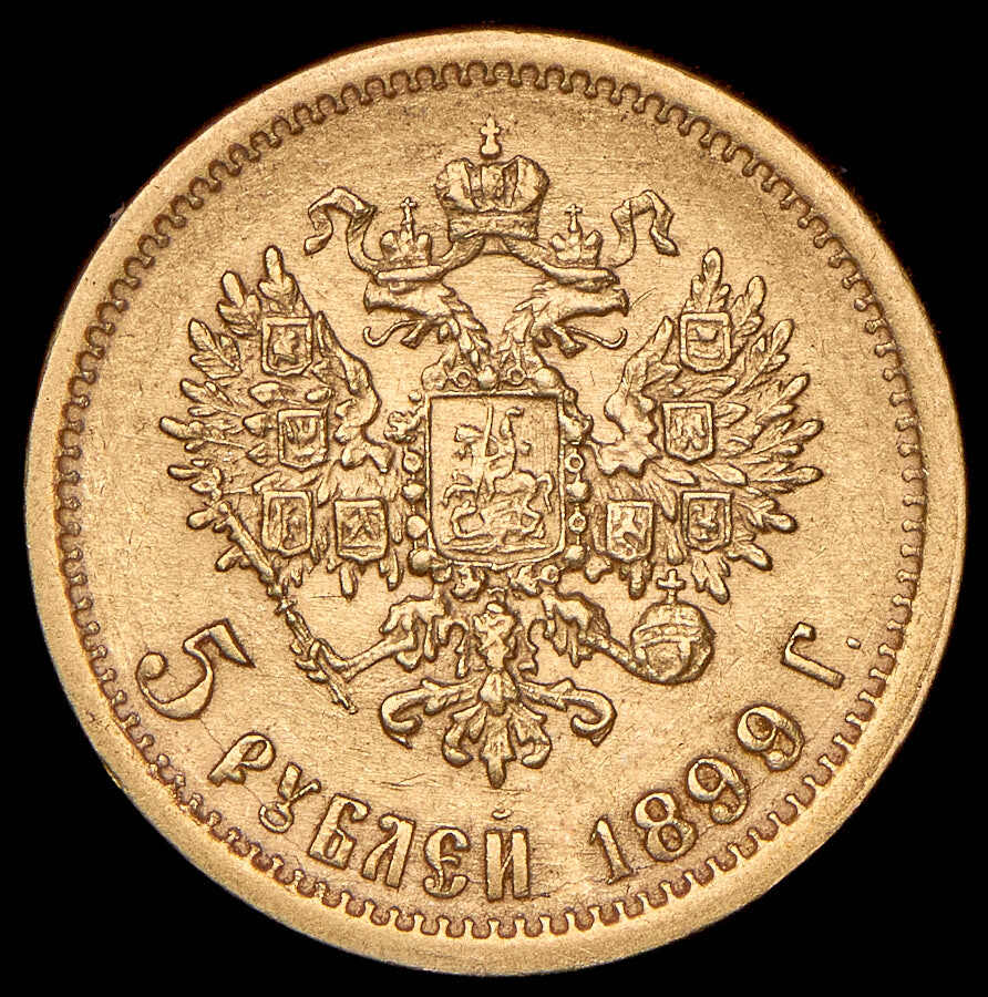 В центре изображен Малый Государственный Герб Российской империи - двуглавый орёл, головы которого увенчаны двумя коронами, третья, большая корона над ними. Все они соединены орденской лентой ордена Св. Апостола Андрея Первозванного. На груди орла расположен Московский герб, в щите изображен Георгий Победоносец с копьем поражающий дракона. Вокруг щита цепь ордена Св. Апостола Андрея Первозванного. На крыльях изображены гербы: Царства Казанского, Польского, Херсонеса Таврического, Астраханского, Сибирского, Грузинского, герб соединенных княжеств Киевского, Новгородского и Владимирского и герб Великого Княжества Финляндского — по 4 на каждое крыло. В правой лапе орла – скипетр, в левой – держава. Под ним слева направо изображены: номинал - надпись «5 РУБЛЕЙ» и дата выпуска «1899 Г.». По окружности канта имеются рельефные элементы, выполненные в виде зубцов.