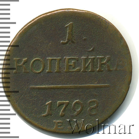 Медные разменные монеты, в период правления императора Павла I, чеканились по 16-ти рублёвой стопе. Монета достоинством 1 копейка, датированная девяносто восьмым годом восемнадцатого века, отчеканена на монетном дворе г. Екатеринбург, о чем свидетельствуют буквы "ЕМ" под датой, на реверсе этой приятной монетки. Тип одно копеечных монет, образца 1797 – 1801 гг. Соостность (расположение аверса к реверсу) – медальная. Разновидность – гурт – шнур влево , рассматривается отдельно в каталоге.