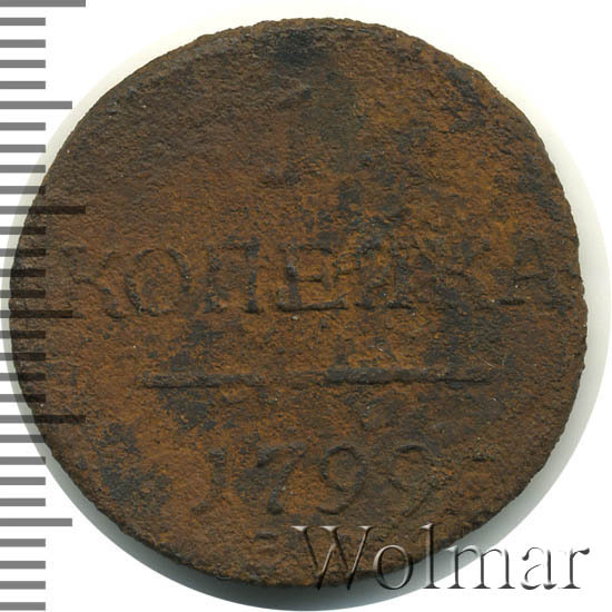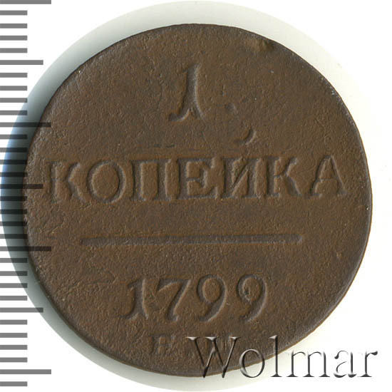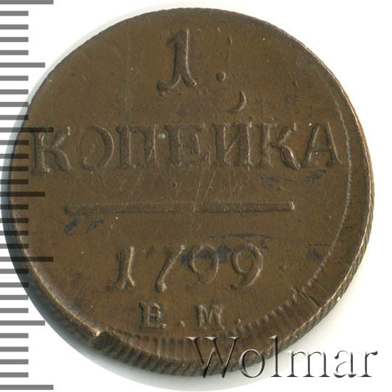 В центре надпись — слово «КОПЕЙКА». Над надписью — цифра «1.». Под надписью — прямая черта, под ней — дата выпуска монеты «1799». Под датой обозначение Екатеринбургского монетного двора — буквы «Е.М.».