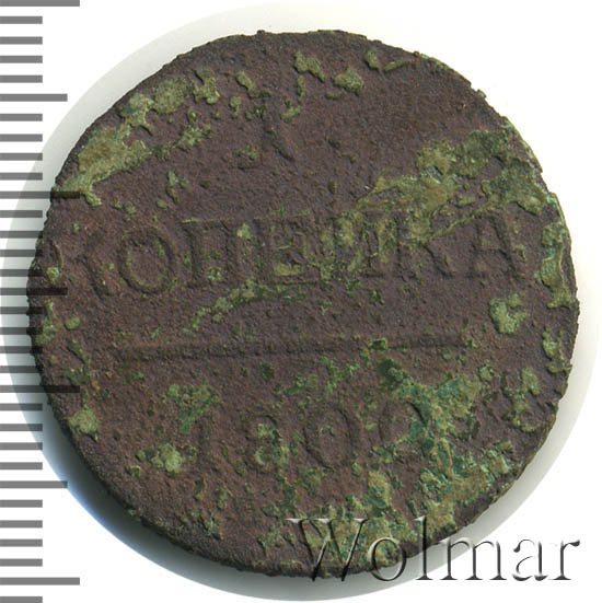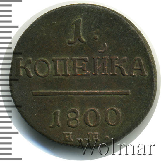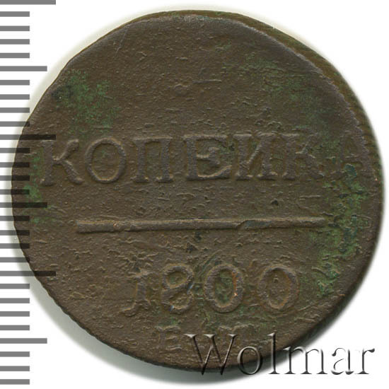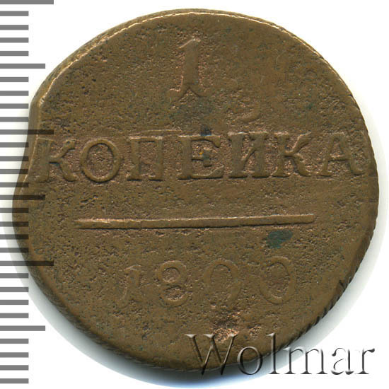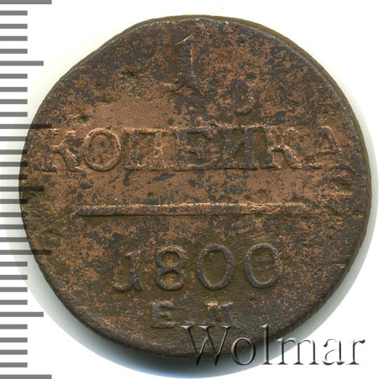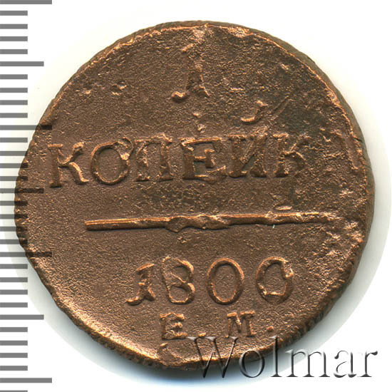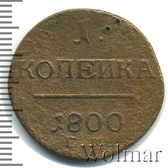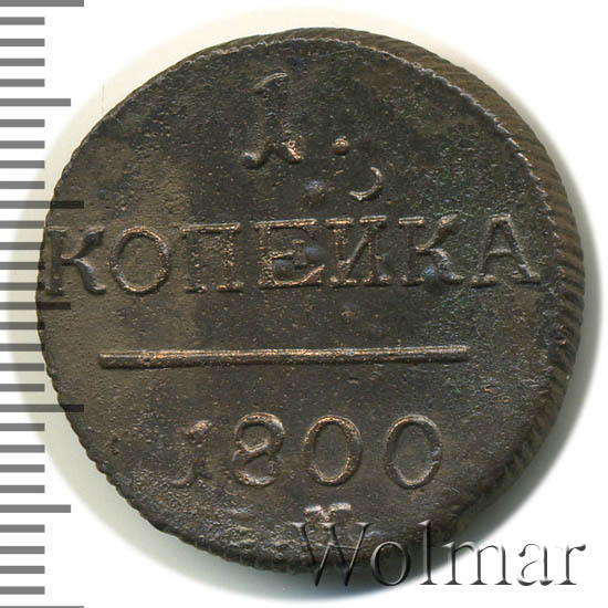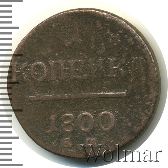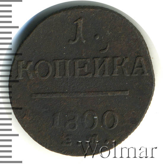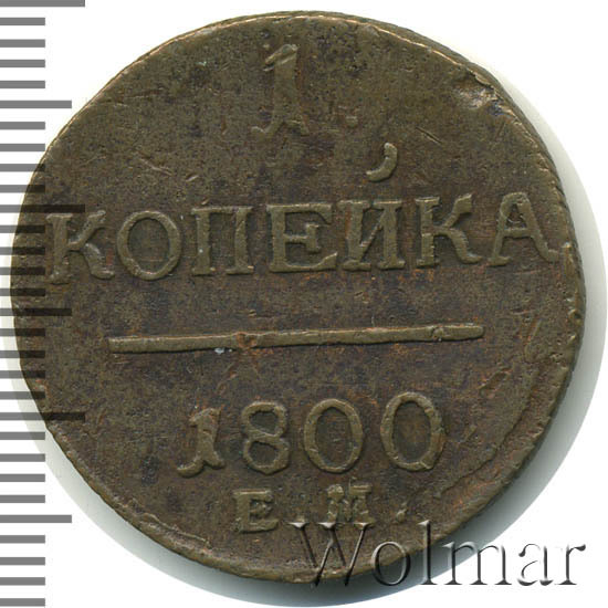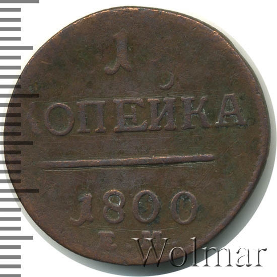 Медные монеты, номиналом 1 копейка, в 1800 года чеканились на Екатеринбургском (ЕМ) и Сузунском (КМ) монетных дворах из расчёта 16 рубля из пуда меди (16,38 кг). Чеканка велась массово, о чём свидетельствует большой тираж 1 копейки 1800 ЕМ. Такой тип чеканился с 1797 г. по 1801 г., во время правления императора Российского государства Павла I. Соостность (расположение аверса к реверсу) – медальная.