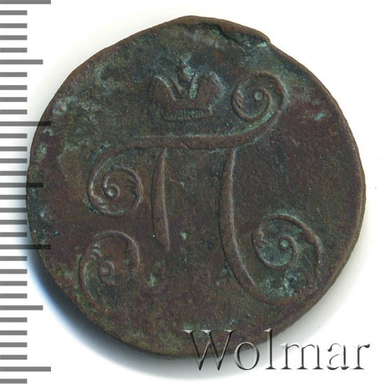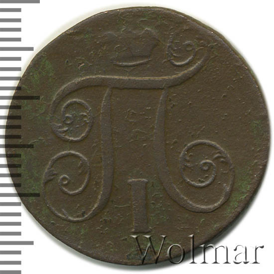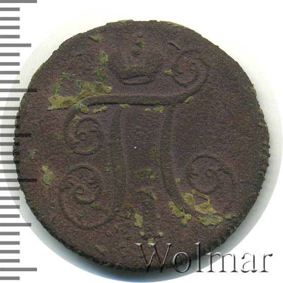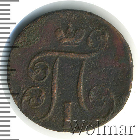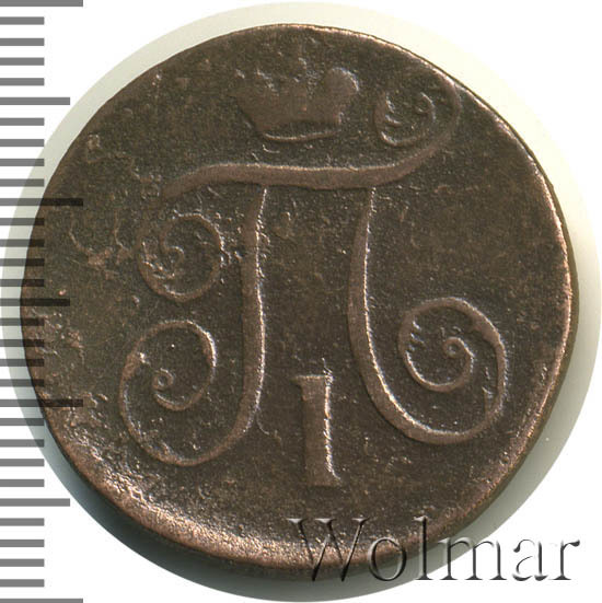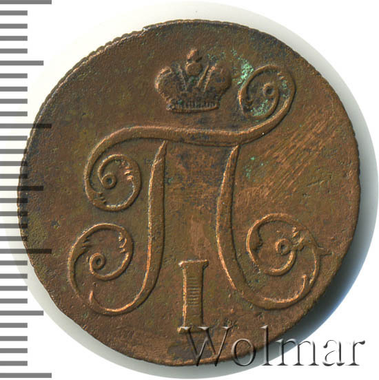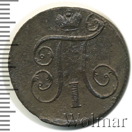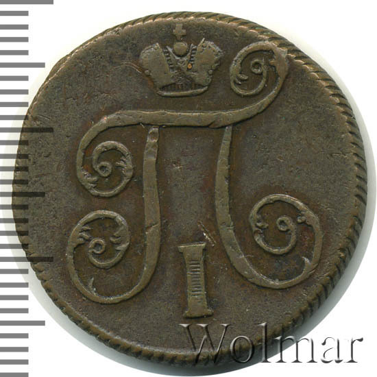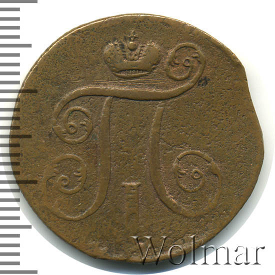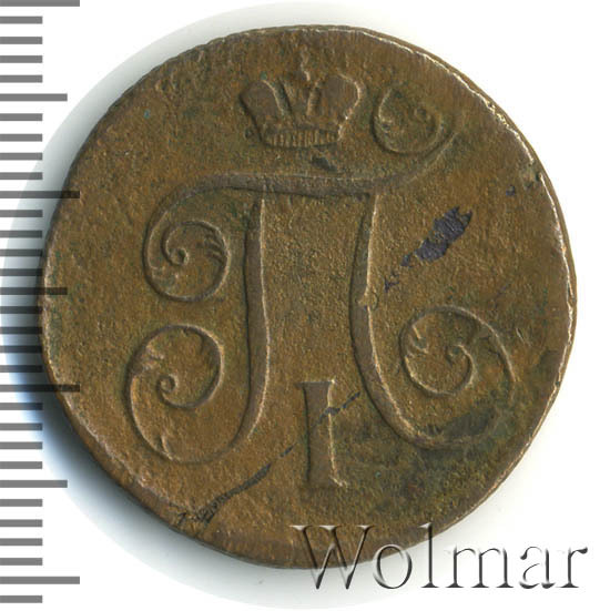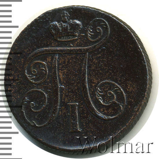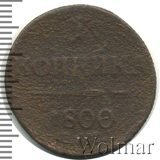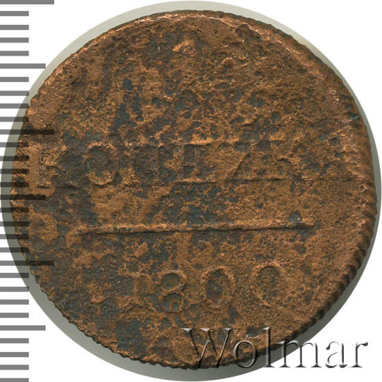Медные монеты, номиналом 1 копейка, в 1800 года чеканились на Екатеринбургском (ЕМ) и Сузунском (КМ) монетных дворах из расчёта 16 рубля из пуда меди (16,38 кг). Чеканка велась массово, о чём свидетельствует большой тираж 1 копейки 1800 ЕМ. Такой тип чеканился с 1797 г. по 1801 г., во время правления императора Российского государства Павла I. Соостность (расположение аверса к реверсу) – медальная.