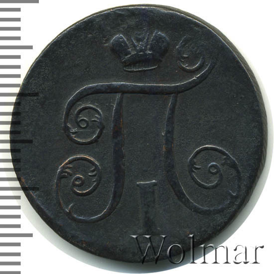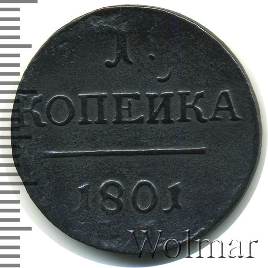 В центре надпись — слово «КОПЕЙКА». Над надписью — цифра «1.». Под надписью — прямая черта, под ней — дата выпуска монеты «1801». Под датой обозначение Екатеринбургского монетного двора — буквы «Е.М.».