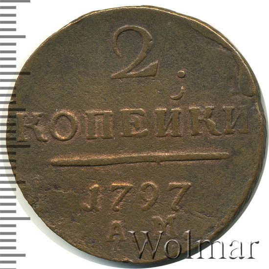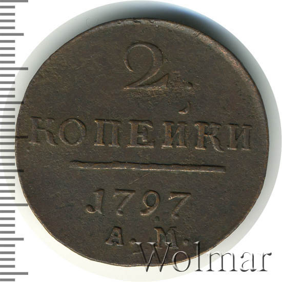 В центре надпись — слово «КОПЕЙКИ». Над надписью — цифра «2.». Под надписью — прямая черта, под ней — дата выпуска монеты «1797». Под датой обозначение Аннинского монетного двора — буквы «А.М.».