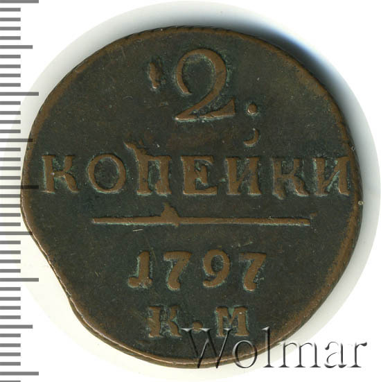 В центре надпись — слово «КОПЕЙКИ». Над надписью — цифра «2.». Под надписью — прямая черта, под ней — дата выпуска монеты «1797». Под датой обозначение Сузунского монетного двора — буквы «К.М».
