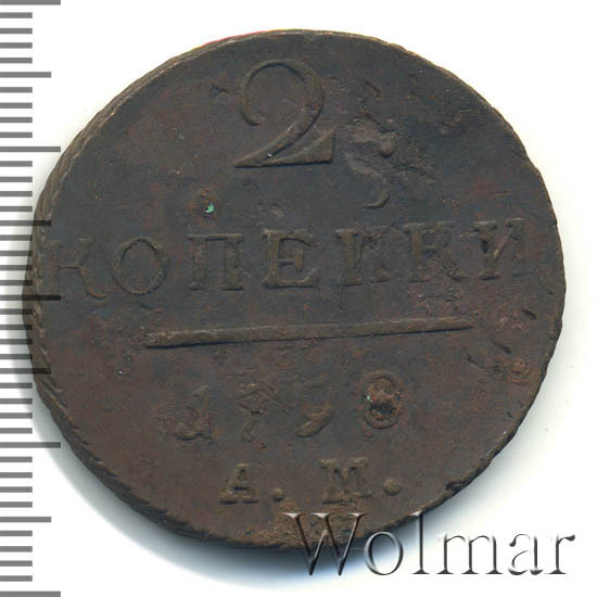 В центре надпись — слово «КОПЕЙКИ». Над надписью — цифра «2.». Под надписью — прямая черта, под ней — дата выпуска монеты «1798». Под датой обозначение Аннинского монетного двора — буквы «А.М.».