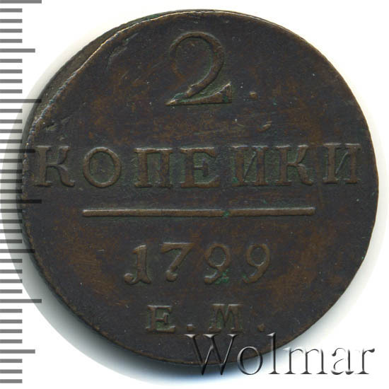 В центре надпись — слово «КОПЕЙКИ». Над надписью — цифра «2.». Под надписью — прямая черта, под ней — дата выпуска монеты «1799». Под датой обозначение Екатеринбургского монетного двора — буквы «Е.М.».