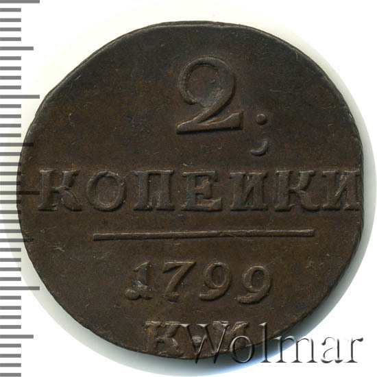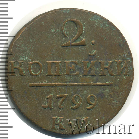 Реверс монеты 2 копейки 1799 года КМ