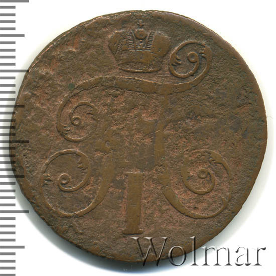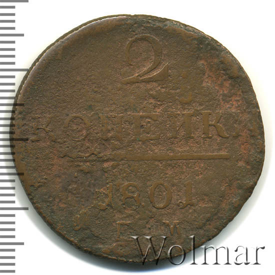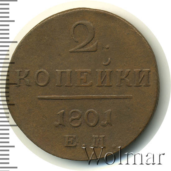 Эта старинная монетка – 2 копейки 1801 ЕМ, была отчеканена на Екатеринбургском монетном дворе более двух веков тому назад. В последний год правления императора Павла I. Из медных разменных монет, для денежного оборота Российской империи, наряду с этим номиналом чеканились только денга и копейка. Выпуск вёлся из расчёта 16 рублей из пуда. Образца 1797 – 1801 годов. Расположение сторон монеты (аверса к реверсу) – медальное. Известна 2 коп. 1801 ЕМ с передатировкой даты (с 1800 г.), которая встречается намного реже обычной.