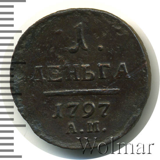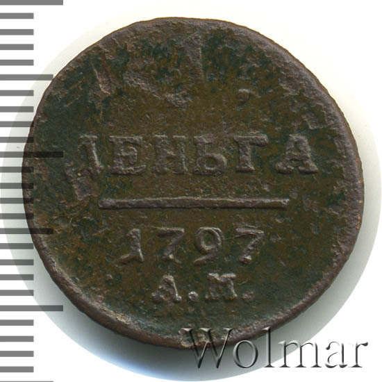 Довольно редкая монетка с аскетичным дизайном, номиналом – денга, датирована девяносто седьмым годом, восемнадцатого века. Отчеканена на Аннинском монетном дворе, расположенном в Пермской губернии, о чём говорят буквы АМ (Аннинская монета), на реверсе этой денги. Производство денги Павла I, на этом мон. дворе, продолжалось всего два года (1797 – 1798 гг). По весовым и геометрическим параметрам и дизайну, соответствует типу 1797 – 1801 гг. Соостность сторон – 0 градусов (медальная). Сведения по тиражу отсутствуют.