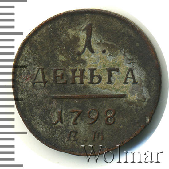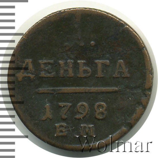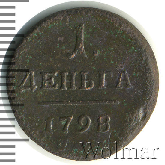 Деньга 1798 года чеканилась из меди весом чуть больше 5 грамм. Выше представлена монета Екатеринбургского монетного двора у которой существует две разновидности, отличающиеся направлением шнурового узора влево или вправо. Ещё известна чеканка на Аннинском (АМ) и Сузунском (КМ) монетных дворах такой же 16 рублевой монетной стопой (16 рублей медной мелочи из пуда металла - 16,38 кг). Название деньга произошло от тюркского слова танка, что означало монета и закрепилось в нашем языке ещё в начале XIV века и могло означать номиналы, разнящиеся по весу. В течении XVI-XVII веков за двухсотой частью рубля закрепляется название денга, позже деньга.