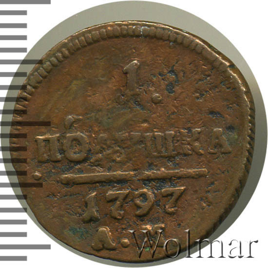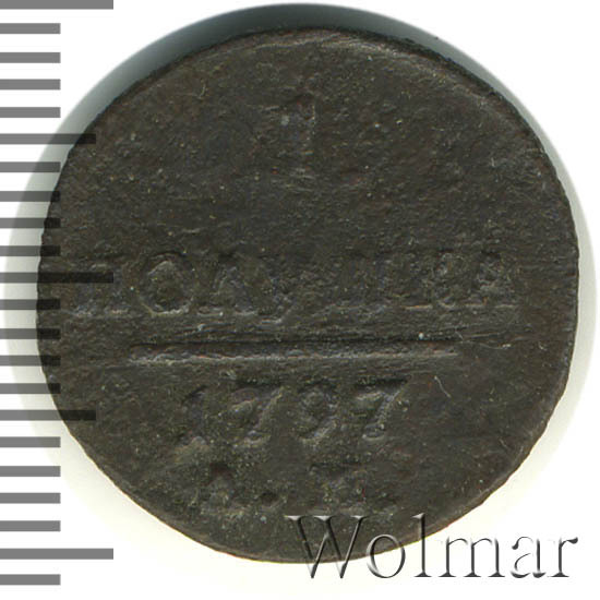 В центре надпись — слово «ПОЛУШКА». Над надписью — цифра «1.». Под надписью — прямая черта, под ней — дата выпуска монеты «1797». Под датой обозначение Аннинского монетного двора — буквы "А.М.". По окружности канта имеются рельефные элементы, выполненные в виде точек.