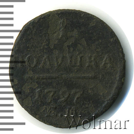 В центре надпись — слово «ПОЛУШКА». Над надписью — цифра «1.». Под надписью — прямая черта, под ней — дата выпуска монеты «1797». Под датой обозначение Екатеринбургского монетного двора — буквы "Е.М.".