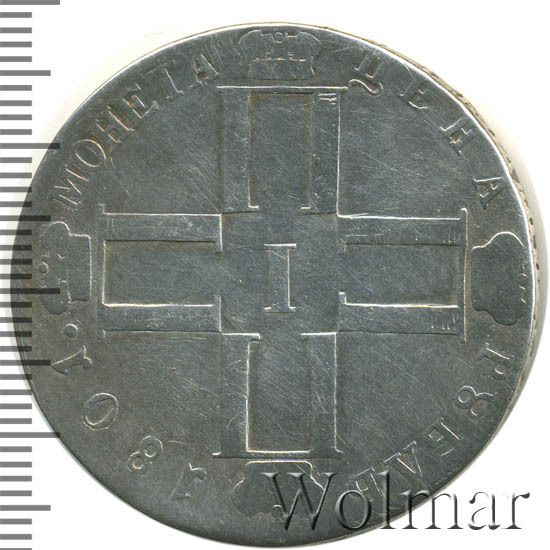 В центре изображена крестообразная монограмма, состоящая из 4 букв «П», увенчанных императорскими коронами и римской цифры «I» в центре. Вдоль канта круговая надпись: «МОНЕТА ЦЕНА РУБЛЬ 1801.», разделённая на 4 части императорскими коронами.