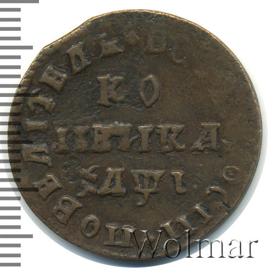 В центре указан номинал в две строки: «КО»│«ПЕИКА». Под надписью, кириллицей, указан год выпуска - ҂АѰI «1710». Вокруг центрального изображения, разделённая крестами, круговая надпись: «ВСЕѦ РОСIИ ПОВЕЛIТЕЛЬ».