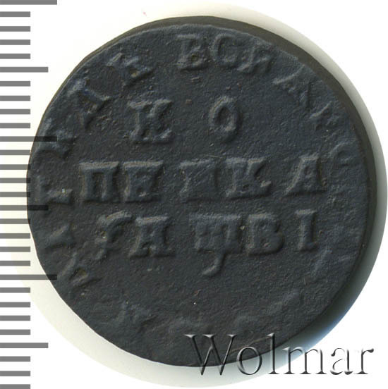В центре указан номинал в две строки: «КО»│«ПЕИКА». Над надписью - розетка. Под надписью, кириллицей, указан год выпуска - «1712». Вокруг центрального изображения круговая надпись: «ВСЕѦ РОСIИ ПОВЕЛIТЕЛЬ».
