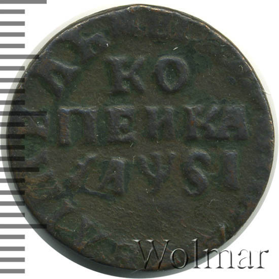 Реверс монеты 1 копейка 1716 года МД