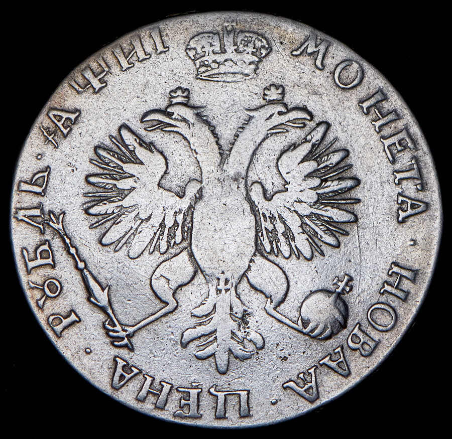 Аверс монеты 1 рубль 1718 года OK-L 2 ряда заклепок