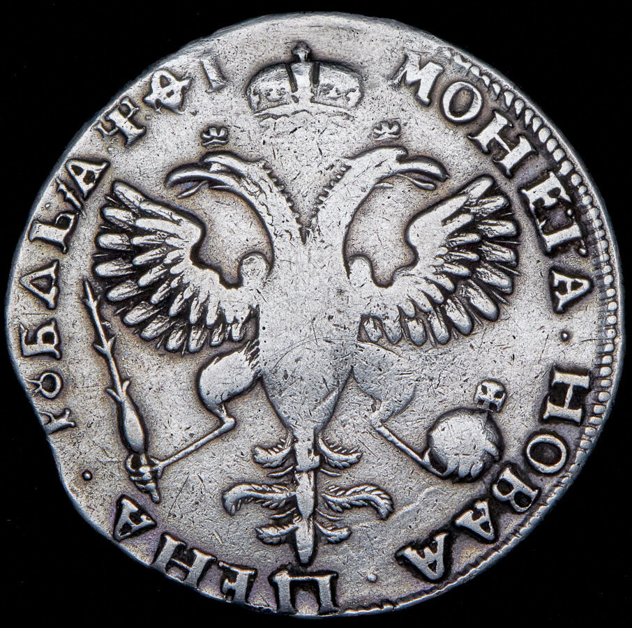 Реверс монеты 1 рубль 1719 года OK-L заклепки на груди