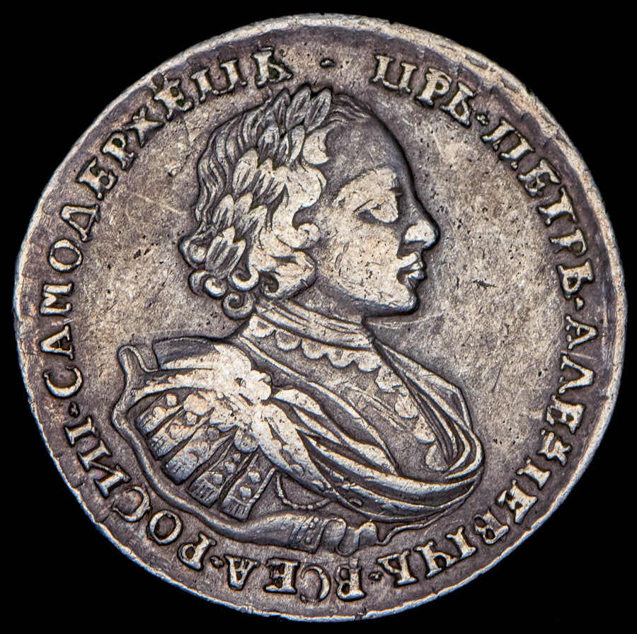 В центре профильный портрет вправо императора Петра I, увенчанный лавровым венком. Вокруг портрета круговая надпись: «ЦРЬ ПЕТРЬ АЛЕξIЕВИЧЪ ВСЕѦ РОСИI САМОДЕРЖЕЦЬ». По окружности канта - витой узорный ободок.