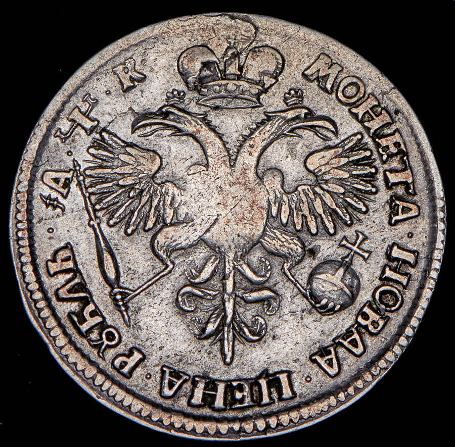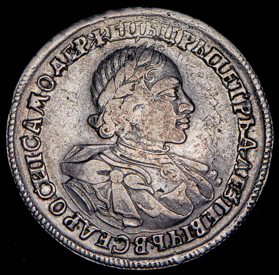 В центре профильный портрет вправо императора Петра I, увенчанный лавровым венком. Вокруг портрета круговая надпись: «ЦРЬ ПЕТРЬ АЛЕξIЕВИЧЪ ВСЕѦ РОСИI САМОДЕРЖЕЦЬ». По окружности канта - витой точечный ободок.