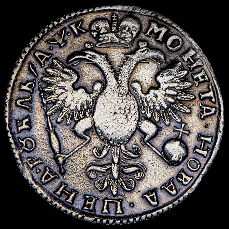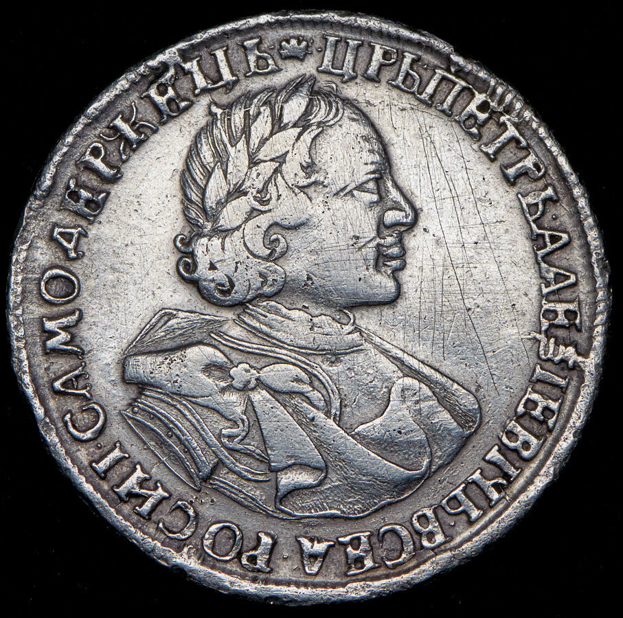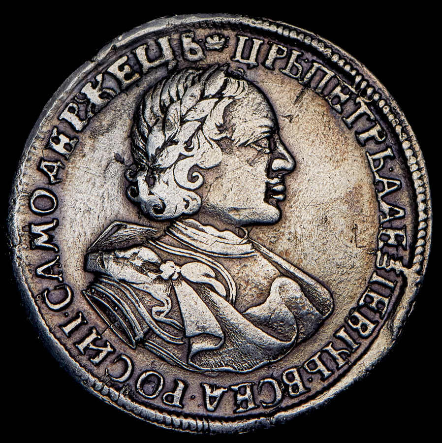 В центре профильный портрет вправо императора Петра I, увенчанный лавровым венком. Вокруг портрета круговая надпись: «ЦРЬ ПЕТРЬ АЛЕξIЕВИЧЪ ВСЕѦ РОСИI САМОДЕРЖЕЦЬ». По окружности канта - витой точечный ободок.