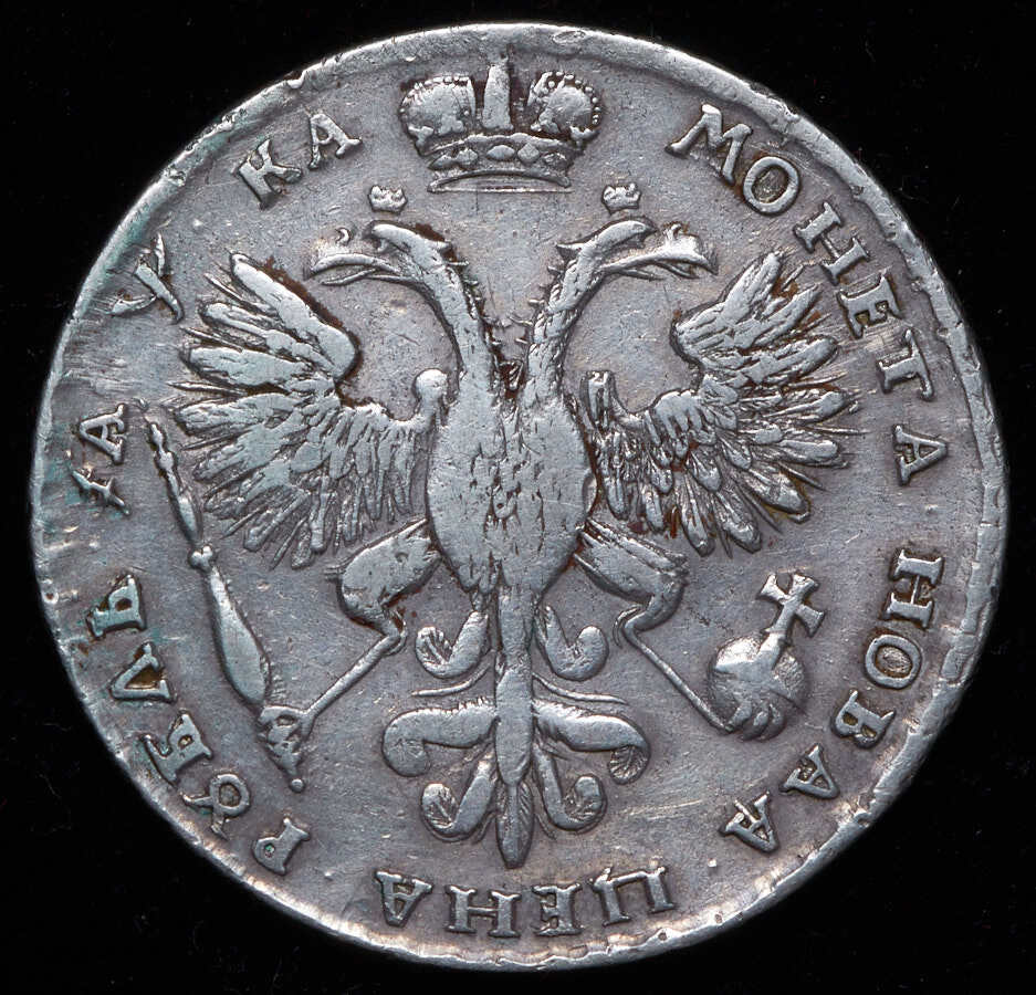 В центре изображен Государственный Герб России - двуглавый орёл с распущенными крыльями. Головы которого увенчаны двумя коронами, третья, большая корона над ними. В правой лапе орла – скипетр, в левой – держава. Вокруг орла надпись: «МОНЕТА НОВАѦ ЦЕНА РУБЛЬ ҂АѰКА (1721)». По окружности канта - витой узорный ободок.