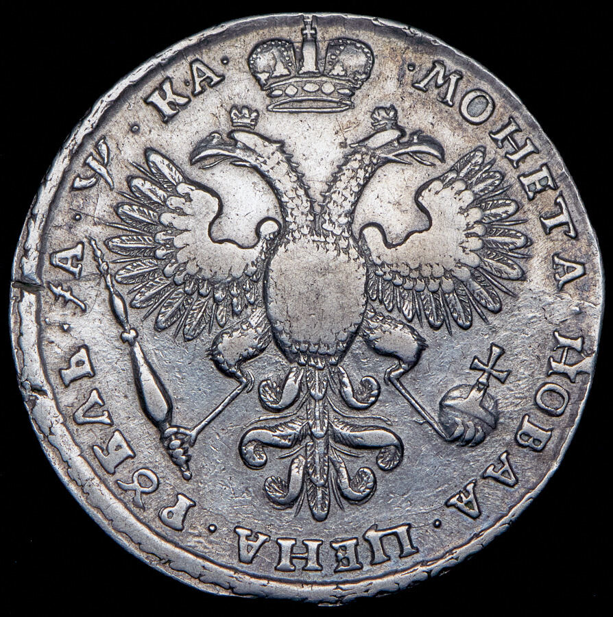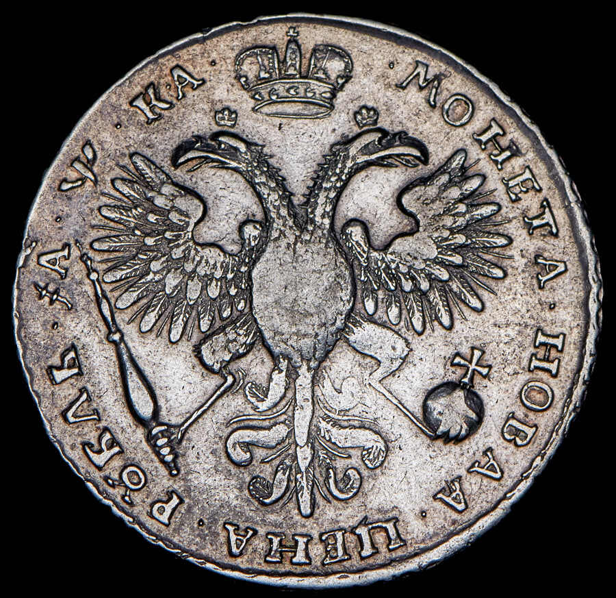 В центре изображен Государственный Герб России - двуглавый орёл с распущенными крыльями. Головы которого увенчаны двумя коронами, третья, большая корона над ними. В правой лапе орла – скипетр, в левой – держава. Вокруг орла надпись: «МОНЕТА НОВАѦ ЦЕНА РУБЛЬ ҂АѰКА (1721)». По окружности канта - витой узорный ободок.
