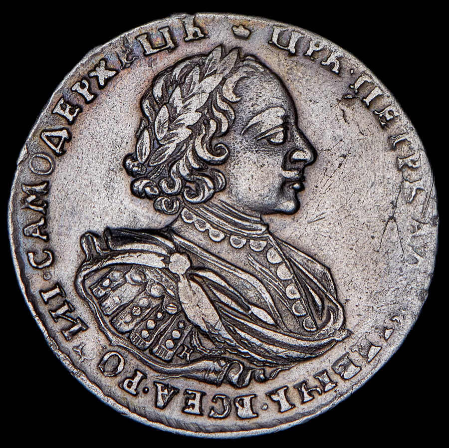 В центре профильный портрет вправо императора Петра I, увенчанный лавровым венком. Под наплечниками — буква «К», знак медальера Осипа Калашникова. Вокруг портрета круговая надпись: «ЦРЬ ПЕТРЬ АЛЕξIЕВИЧЪ ВСЕѦ РОСИI САМОДЕРЖЕЦЬ». По окружности канта - витой узорный ободок.