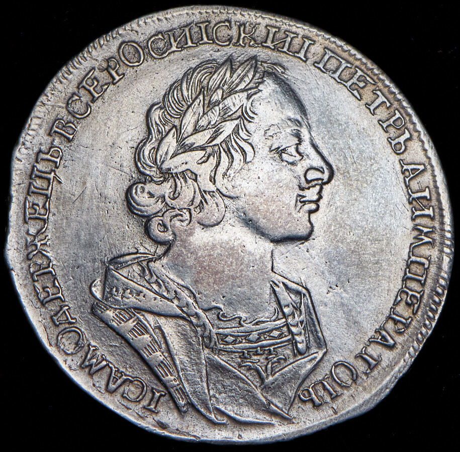 В центре профильный портрет вправо императора Петра I, увенчанный лавровым венком. Вокруг портрета надпись: «ПЕТРЪ А ИМПЕРАТОРЪ IСАМОДЕРЖЕЦЪ ВСЕРОССИIСКИI». По окружности канта - витой ободок.