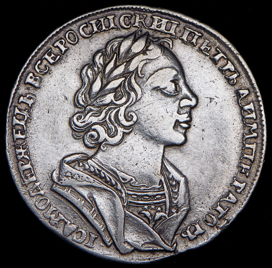 В центре профильный портрет вправо императора Петра I, увенчанный лавровым венком. Вокруг портрета надпись: «ПЕТРЪ А ИМПЕРАТОРЪ IСАМОДЕРЖЕЦЪ ВСЕРОССИIСКИI». По окружности канта - витой ободок.