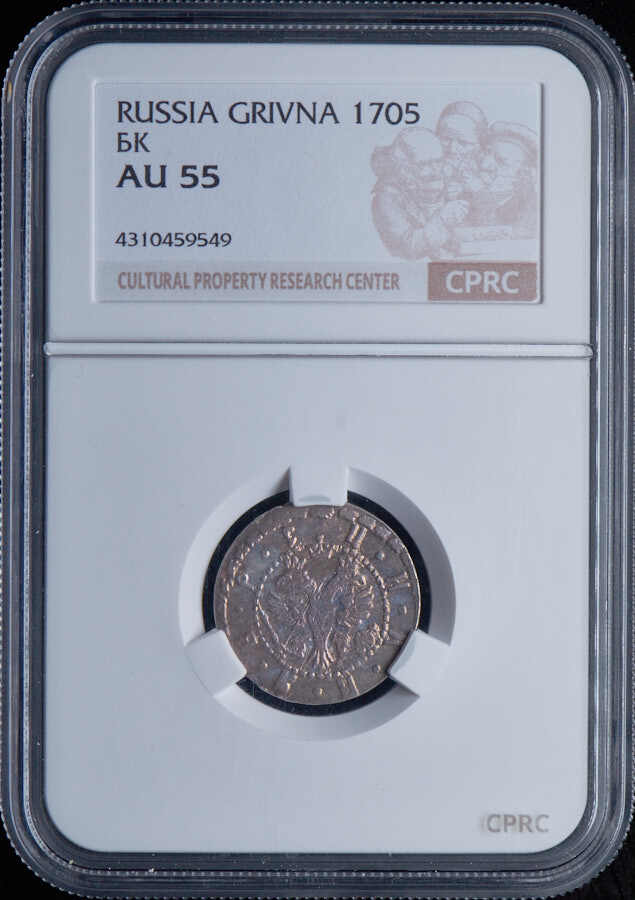 Grivna 1705, Red Mint, БK. 2.56 g. Bitkin -. Severin 155. GM 19,20. Diakov 216 (R3). Rare. 2 roubles acc. to Petrov. Pierced & repaired. Tooled Аукцион: Sincona AG Состояние: F | 14.10.2015 |