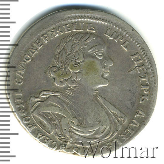 В центре профильный портрет вправо императора Петра I, увенчанный лавровым венком. Вокруг портрета круговая надпись: «ЦРЬ ПЕТРЪ АЛЕξIЕВИЧЪ ВСЕѦ РОСИI САМОДЕРЖЕЦЪ». По окружности канта - витой точечный ободок.
