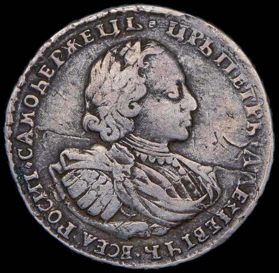 В центре профильный портрет вправо императора Петра I, увенчанный лавровым венком. Вокруг портрета круговая надпись: «ЦРЬ ПЕТРЪ АЛЕξIЕВИЧЪ ВСЕѦ РОСИI САМОДЕРЖЕЦЪ». По окружности канта - витой узорный ободок.