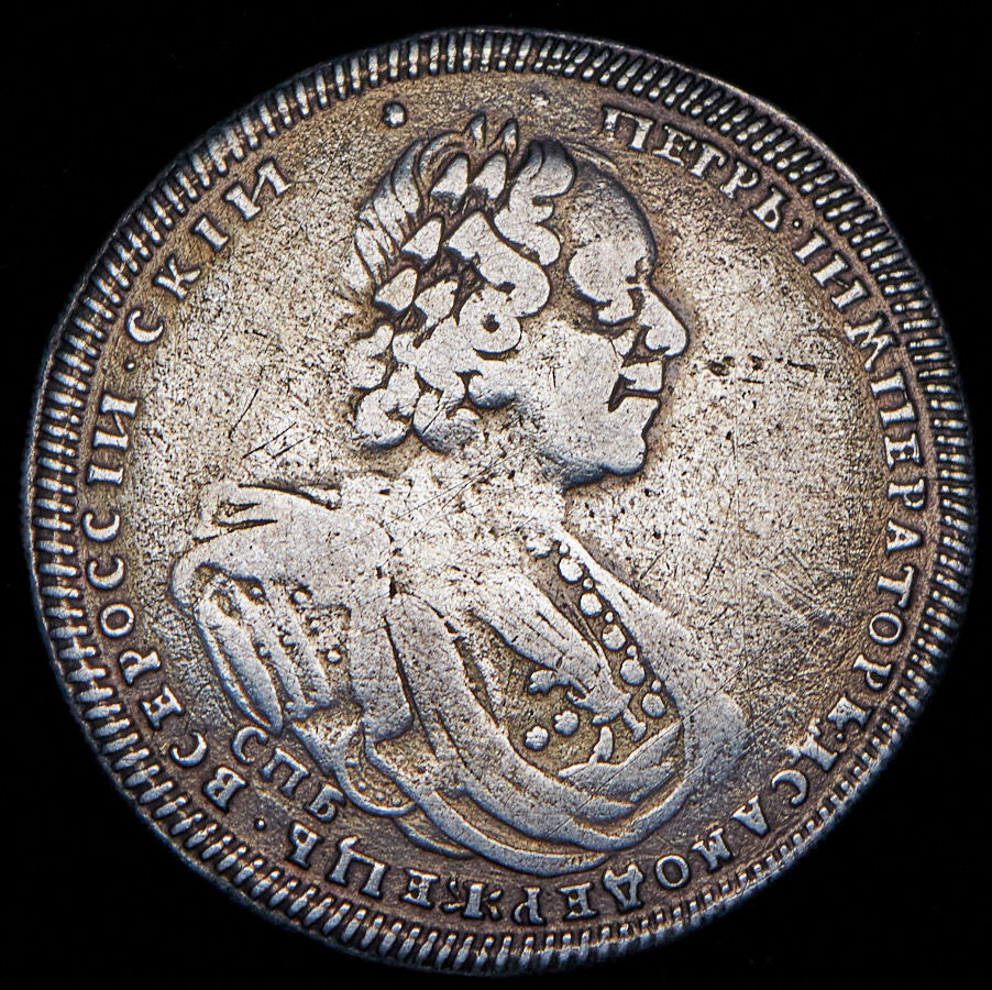В центре профильный портрет вправо императора Петра I, увенчанный лавровым венком. Под портретом – буквы «СПБ», обозначение Санкт-Петербургского монетного двора. Вокруг портрета надпись: «ПЕТРЪ I ИМПЕРАТОРЪ IСАМОДЕРЖЕЦЪ ВСЕРОССIИCКIИ». По окружности канта - витой ободок.