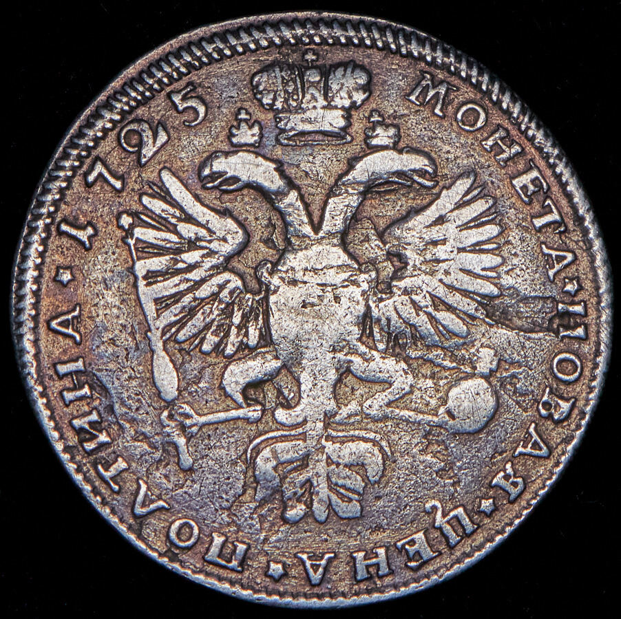 В центре изображен Государственный Герб Российской империи - двуглавый орёл с распущенными крыльями. Головы которого увенчаны двумя коронами, третья, большая корона над ними. В правой лапе орла – скипетр, в левой – держава. Вокруг орла надпись: «МОНЕТА НОВАЯ ЦЕНА ПОЛТИНА 1725». По окружности канта - витой ободок.